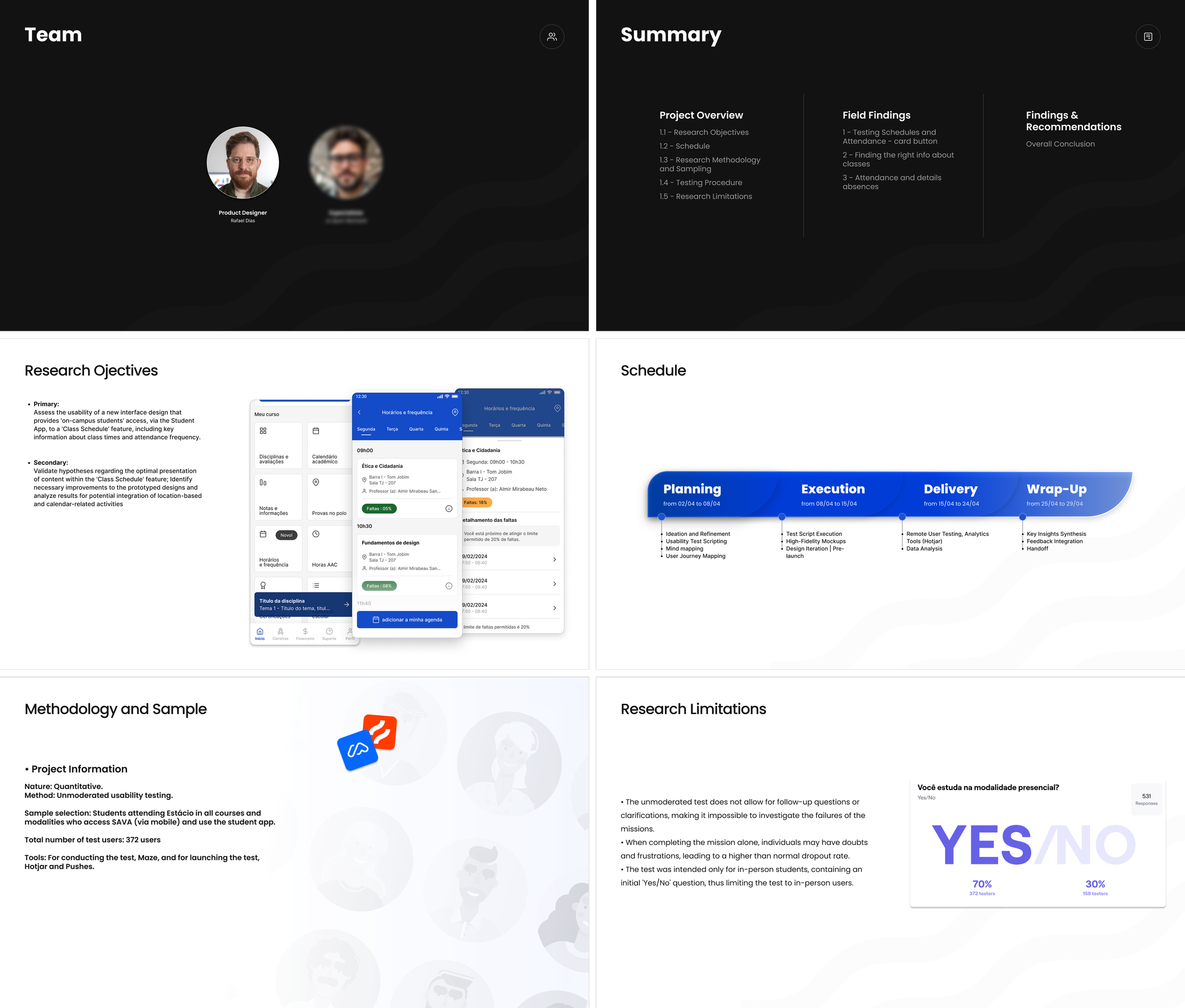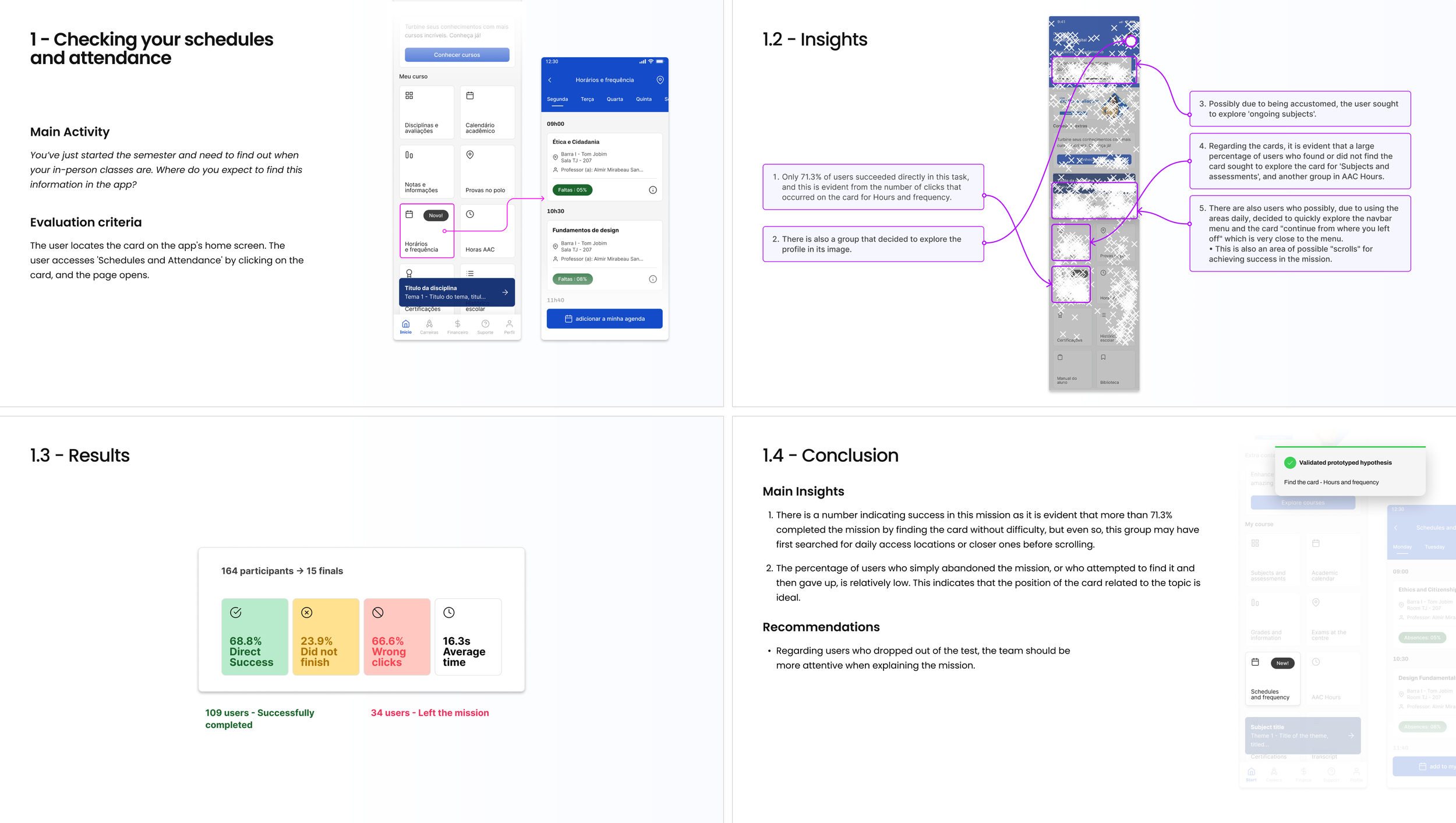 This project aimed to validate whether students could easily find critical academic information, such as schedules, attendance, and absence rates, within a newly designed area of the app.