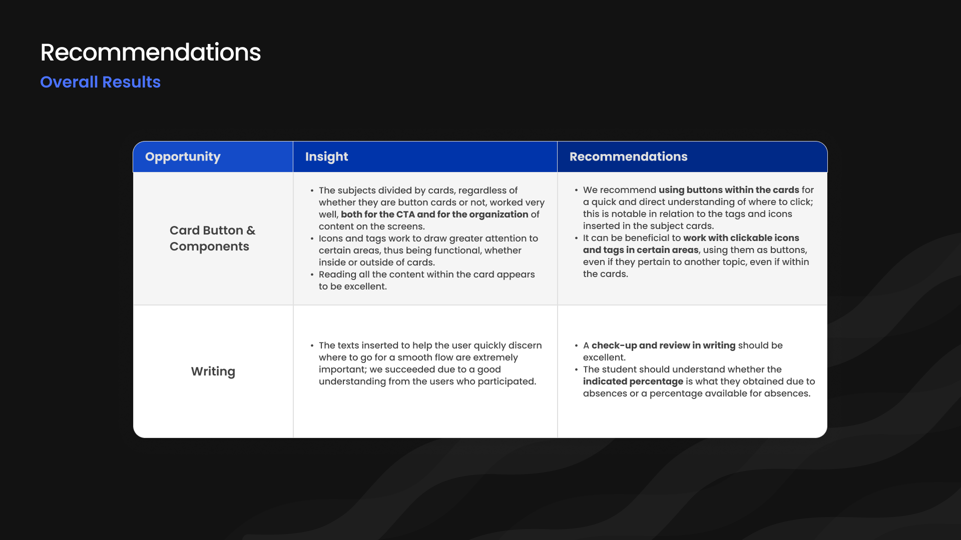 Results showed a high success rate, validating the card layout as a primary entry point, while also revealing opportunities to improve interaction clarity.